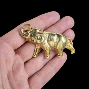 This large vintage elephant brooch is modelled in solid silver and gilded in a sunny 18ct yellow gold. He’s depicted in a proud stance, with trunk coiled above his head and features engraved detailing across the front.